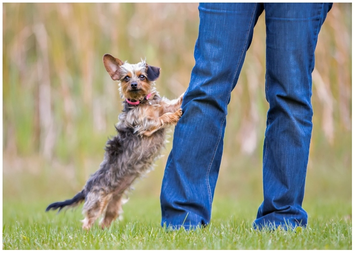 Make it clear to your dog that jumping is never acceptable. If they jump up, turn away and ignore them until they calm down. Only give attention, treats, or playtime when all four paws are on the ground. This teaches your dog that jumping up is not a successful way to receive attention.