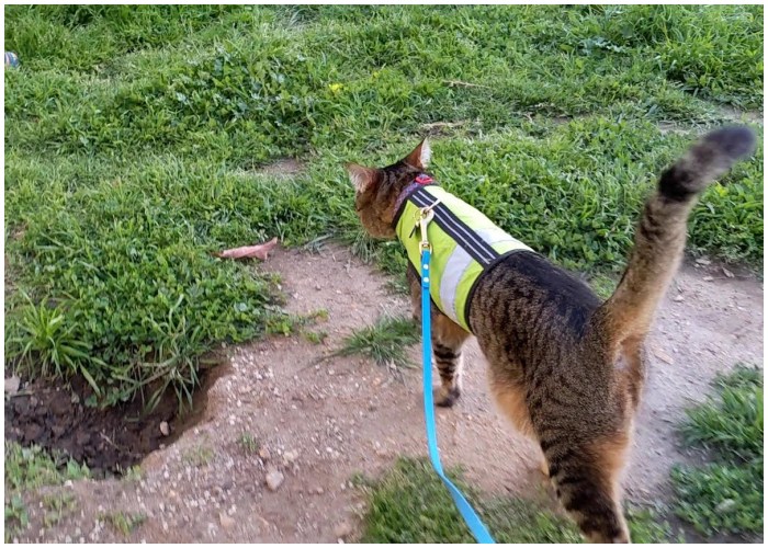 When your cat is comfortable with the harness and leash indoors, it’s time for the first outdoor adventure. Choose a quiet, safe area for the initial outing. If you have a yard, start there. For apartment dwellers, find a calm, dog-free space. Always carry your cat outside to prevent them from associating the door with freedom. Monitor your cat for signs of fear, such as a fluffed tail or refusal to move. Keep the first trip short and gradually increase the duration as your cat becomes more confident.